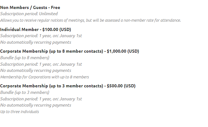 Corporate Membership (for up to 3 individuals to attend at member rate at any meeting) $500